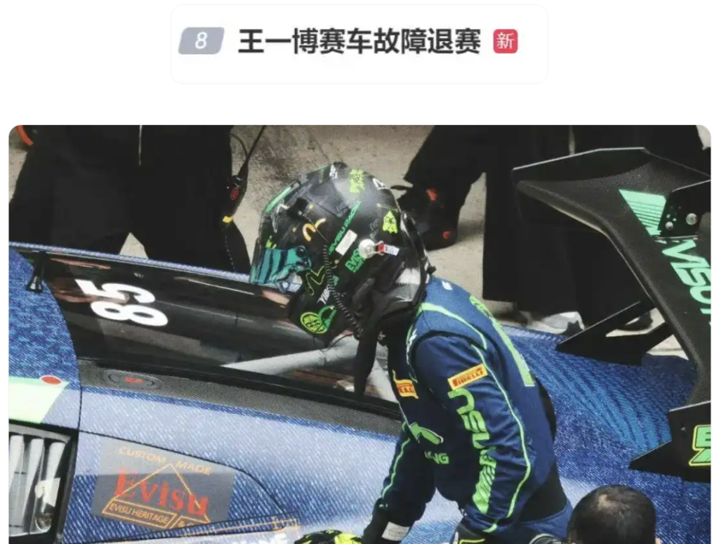 而到了第二回合正赛,王一博驾驶的85号赛车发车后一度排名第五,比赛中的进站环节,赛车停滞在了维修区,未能重返赛道。从社交网络上流传的比赛视频可以看到,王一博上车后又下车,最终选择退赛。